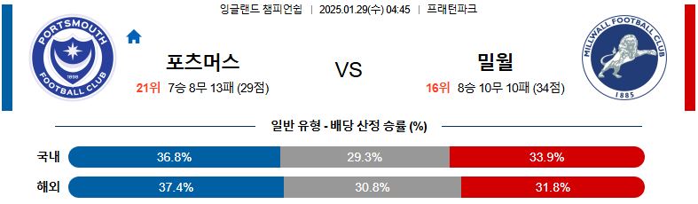 01일 29일 04:45 잉글랜드 챔피언쉽 포츠머스 FC 밀월 FC
