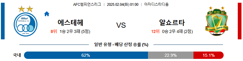 ACLE 일정 5경기 무승(2무3패)의 늪에 빠지는 과정에서 2득점, 8실점에 그치고 있는 에스테그랄 이지만 상대는 자신들 보다 더 좋지 않은 행보를 보이고 있는 최약체 알 쇼르타가 된다. 알 쇼르타 보다는 중원 싸움에서 우위를 가져갈수 있는 전력 이다. 또한, 알 쇼르타는 수비에 많은 문제점을 노출하고 있는 팀 이다.