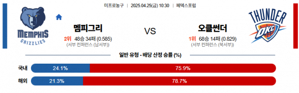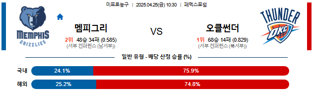 04월 25일 10:30 NBA 멤피스 그리즐리즈 vs 오클라호마시티 썬더