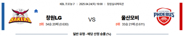 04월 24일 19:00 KBL 창원 LG 울산 현대모비스