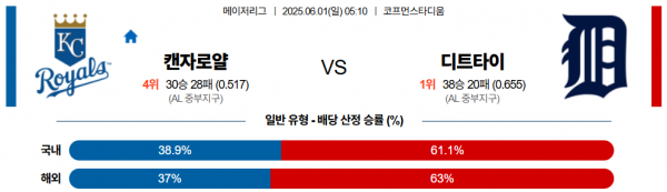 6월 1일 MLB 캔자로얄 vs 디트타이