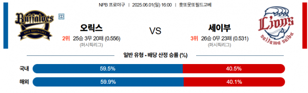 치바 롯데 : 이시카와 슈타(2패 4.03)가 시즌 첫 승에 재도전한다. 20일 오릭스 원정에서 6이닝 1실점의 호투를 보여준 이시카와는 세이부 원정의 부진을 벗어났다는 점이 고무적이다. 야간 경기 강점은 있고 일단 홈 경기에 강하다는 점에 승부를 걸어야 할 투수일 것이다.