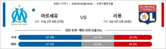 마르세유가 홈에서 리옹을 상대로 승리할 가능성이 높으며, 언오버 2.5를 초과하는 경기가 될 것으로 보입니다.