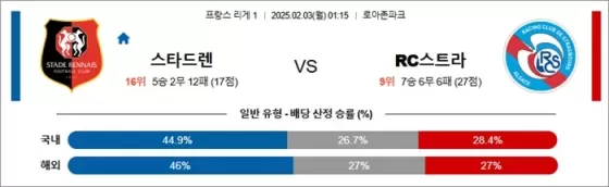 스타드 렌과 RC 스트라스부르의 경기는 두 팀 모두 최근 성적이 비슷하여 흥미로운 대결이 될 것입니다.