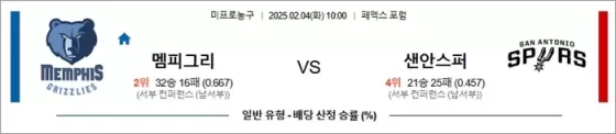 2025년 2월 4일 NBA 경기에서 멤피스 그리즐리가 샌안토니오 스퍼스를 상대로 승리할 가능성이 높으며,