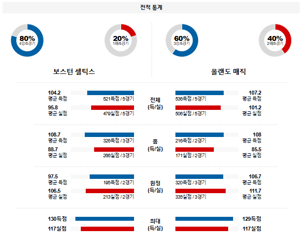 올시즌 상대전에서 열세를 보였지만 1경기는 주전들을 뺐던 경기였고 지난 1차전 원정에서 4점차 패배(104-108)는 1옵션이 되는 제이슨 테이텀이 결장했던 보스턴이 베스트 전력을 가동한 PO 1차전에서 올랜도를 압도했다. 또한, 맞대결 홈에서는 4연승을 기록중인 보스턴 이다. 다만, 1차전 4쿼터 초반 켄타비우스 칼드웰-포프의 위험한 파울로 중심을 잃은 테이텀은 바닥에 쓰러지며 손목에 충격을 입었고 현재 결장 확률이 높은 'doubtful' 상태로 부상자 명단에 오르면서 2차전에서 결장할 가능성이 높아진 상황. 핸디캡 승부에서는 올랜도의 손을 들어줄수 있는 2차전 이다.