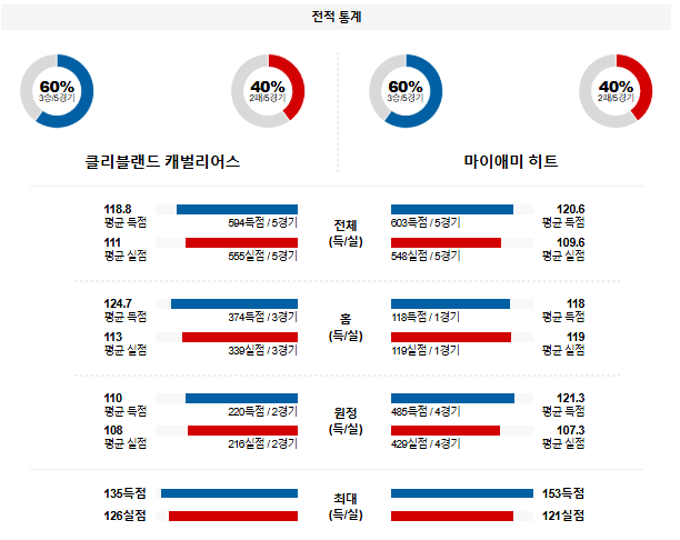 뛰어난 득점과 플레이메이킹 능력을 자랑하는 클리블랜드 백코트 조합의 위력이 나타날 것이다. 다만, 현재의 플레이인 포맷이 도입된 2020-21 시즌 이후 처음으로 10번 시드로 플레이오프에 진출하게 된 마이애미의 기세를 핸디캡 승부에 반영해야 하며 오버 경기다.
