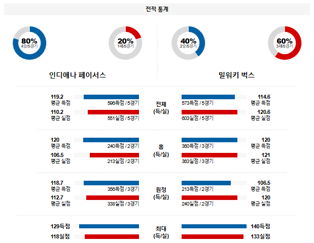 밀워키는 데미안 릴라드가 왼 발목 아킬레스건 파열로 전력에서 이탈하게 된다. 야니스 아테토쿤보가 시리즈 내내 꾸준한 득점력을 선보이고 있지만 외곽에서 공격의 실마리를 풀어줄수 있는 선수가 나오지 않고 있다. 인디애나가 시리를 끝낼 것이며 공격 템포를 끌어올릴 것으로 예상되는 만큼 오버 경기다.