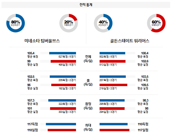 1차전에서 승리를 기록했지만 스테판 커리를 잃은 골든스테이트는 2,3,4차전에서 외곽 공격에서 실마리를 풀지 못했고 연속 패배를 당했다. 미네소타가 제공권을 장악하는 가운데 승리를 가져갈 것이다. 다만, 핸디캡 범위는 과하다고 생각 된다.