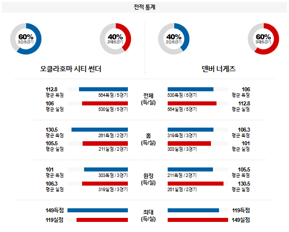 덴버는 팀의 핵심 수비수이자 니콜라 요키치의 골밑 파트너 애런 고든이 햄스트링 염좌 진단을 받았다. 또한, 핵심 전력이 되는 자말 머레이와 러셀 웨스트브룩도 부상으로 출전 여부가 불투명 하다. 오클라호마가 강한 압박 수비와 베스트5 대결에서 우위를 기록할 것이다.