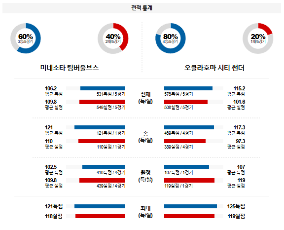 외곽슛 위주의 게임 플랜을 설계하는 팀에게 약점을 보이고 있는 미네소타 수비의 문제점이 시리즈에서 계속해서 나타나고 있다. 원정에서의 경기가 되지만 오클라호마의 기세가 이어질 것이다.